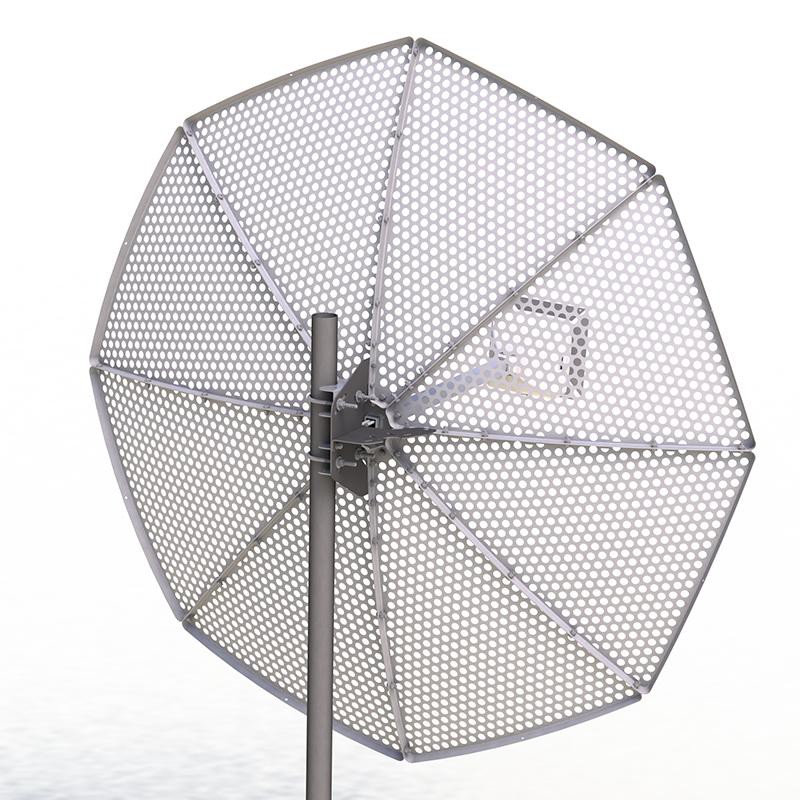 - Сетчатый рефлектор для ветровой нагрузки. В эксплуатации модель выдерживает порывы ветра благодаря облегченной структуре рефлектора, а оцинкованные элементы предотвращают ржавчину в прибрежных зонах или лесных районах. Все элементы антенны защищены от влаги и пыли и работают в диапазоне температур от -50°C до +80°C.