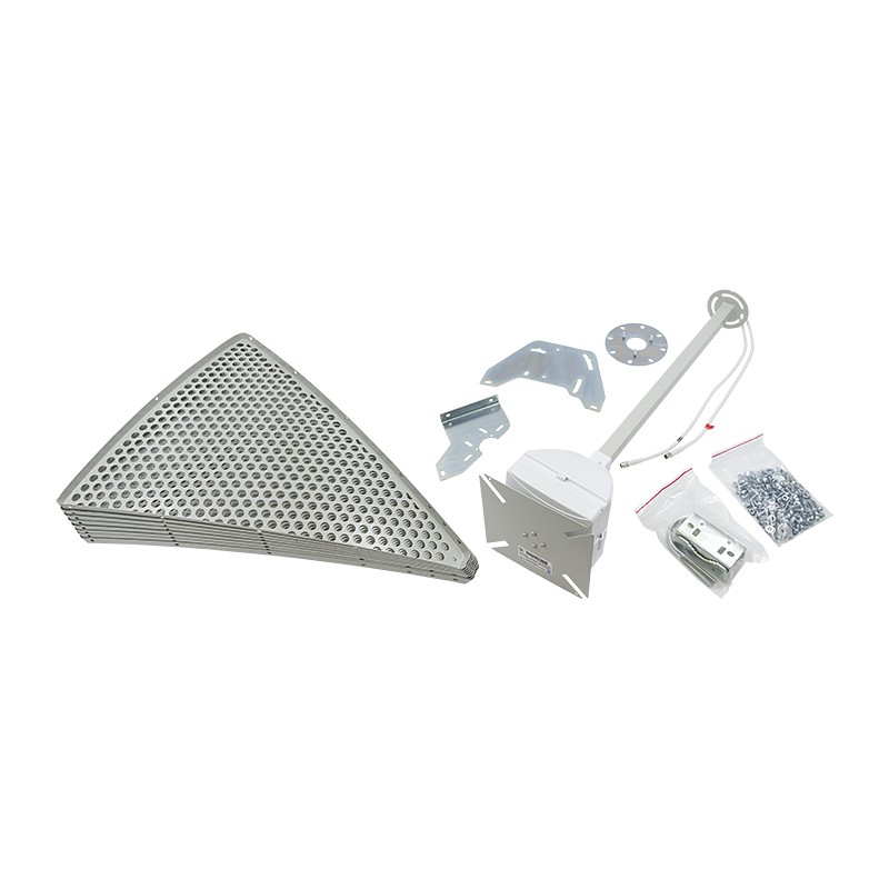 - Разборная конструкция из 8 секторов. Отражатель собирается из сегментов болтами, образуя поверхность большой площади для отражения радиоволн. В разобранном виде антенна помещается в упаковку 610 x 610 x 150 мм, а сборка занимает 20–30 минут по инструкции;