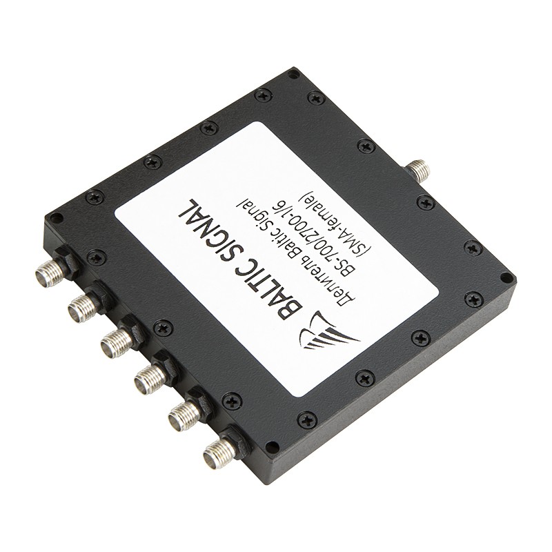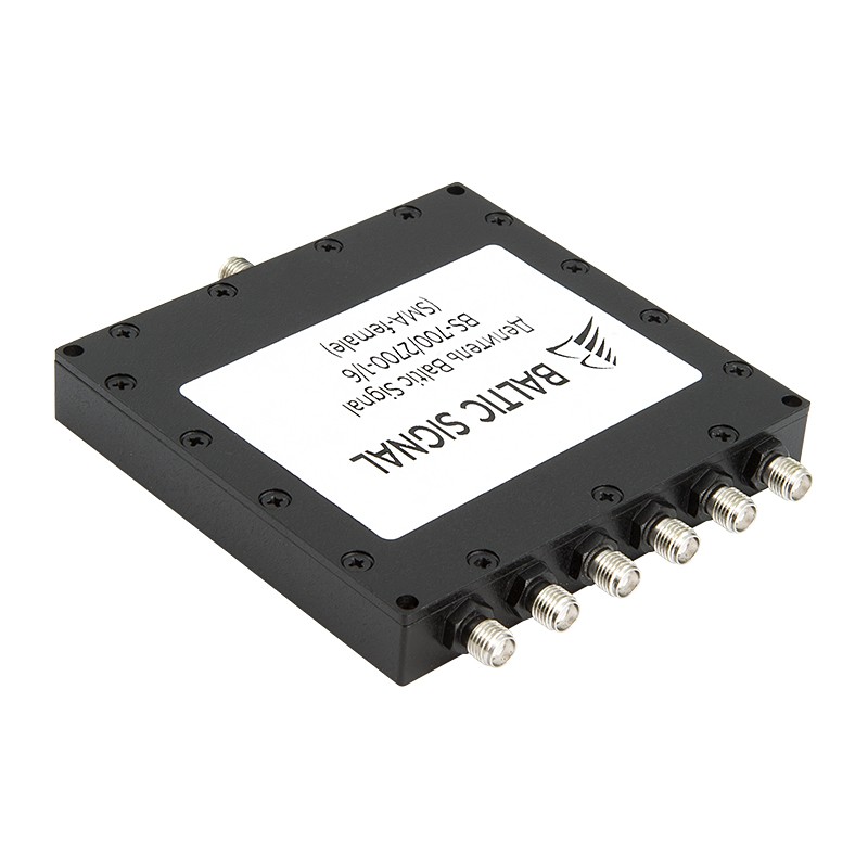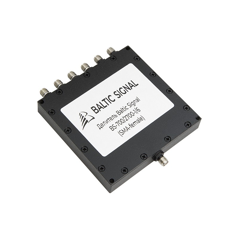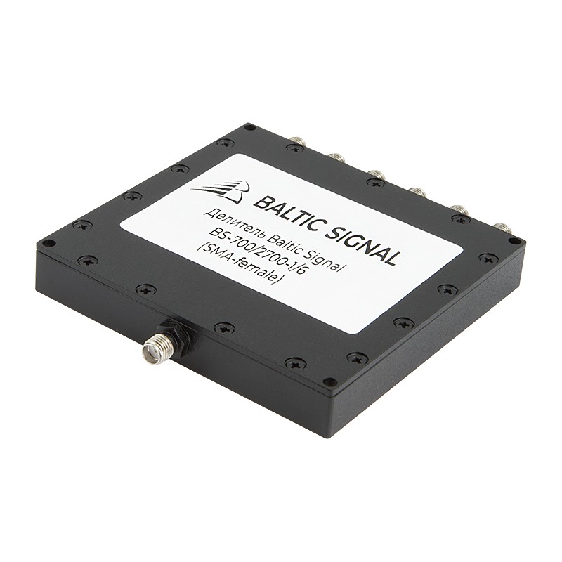 Делитель BS-700/2700-1/6 разработан для задач, требующих высокой надежности и точности. Устройство функционирует по схеме Уилкинсона, разделяя сигнал на шесть каналов через разъемы SMA-female — компактные соединители с резьбовым сопряжением вилки и розетки.