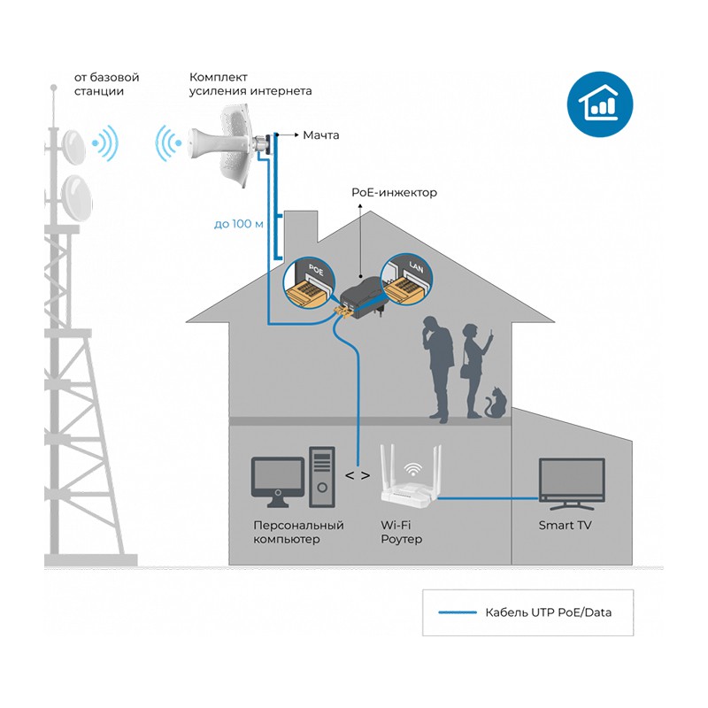 - Ethernet-порт уличного роутера соединяется со входом PoE-инжектора обычным кабелем «витая пара». Питание может передаваться на дистанцию до 100 м, что позволяет разместить LTE-оборудование на большом расстоянии от устройства, которому нужен интернет. PoE-инжектор для питания уже входит в комплект поставки, а патч-корд покупается дополнительно в зависимости от нужной длины;