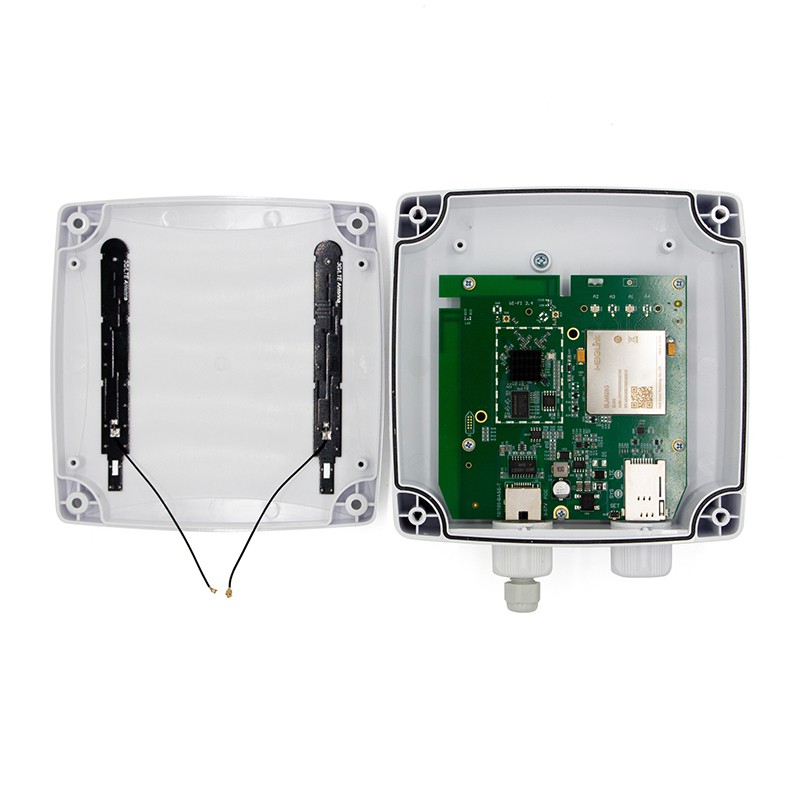 Внутри корпуса установлен промышленный модем MeiG класса LTE Cat. 4. Пиковая скорость приема — 150 Мбит/с, отдачи — 50 Мбит/с. В реальных городских условиях ожидайте 30–50 Мбит/с в зависимости от нагрузки на базовую станцию и условий приема. Этого хватает для облачных сервисов, IP-телефонии, систем мониторинга и онлайн-касс.