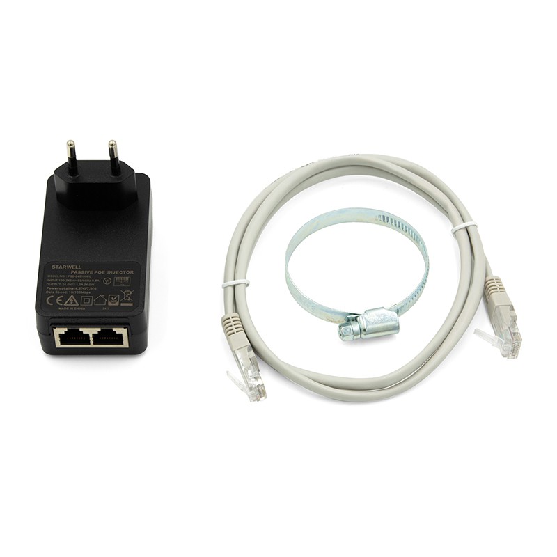 Питание передается по стандарту Passive PoE через обычную витую пару. В комплекте — инжектор питания 24В/1А, который включается в розетку 220В. К нему подключаются два патч-корда: один на улицу к роутеру, второй — к вашему компьютеру или домашнему WiFi-маршрутизатору. В комплект входит лишь короткий патч-корд (1 м) для тестовых целей, длинные кабели для подключения заказываются в каталоге.