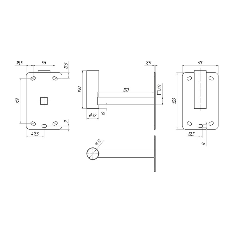 - Труба Ø32 мм. На кронштейн можно установить большинство антенн GSM/3G/4G, использующих стандартное крепление со скобой. Также возможен монтаж WiFi-оборудования (точек доступа), ТВ-антенн, уличных LTE-роутеров и других наружных устройств;