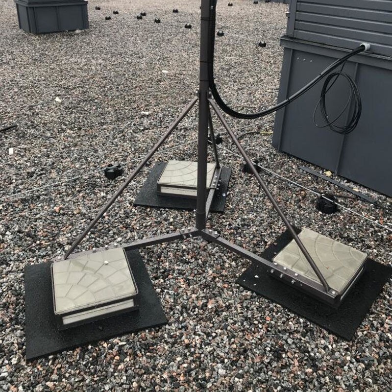 Мачта состоит из стального ствола высотой 3 м и разборной треноги с подгружными опорами. Тренога создает широкую базу для устойчивости, а бетонные плиты выступают пригрузом, предотвращая опрокидывание на ветру.