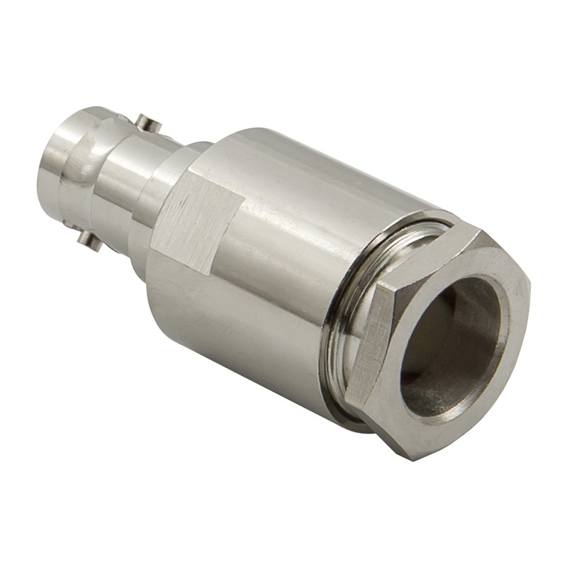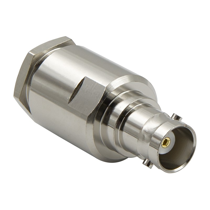 Прижимной разъем BNC-female (розетка) для установки на коаксиальный кабель RG-213. Центральная жила припаивается к контакту, а корпус фиксируется на кабеле без использования обжимного инструмента — затягиванием гайки. Байонетное соединение позволяет быстро подключать и отключать кабель от оборудования простым поворотом на четверть оборота.