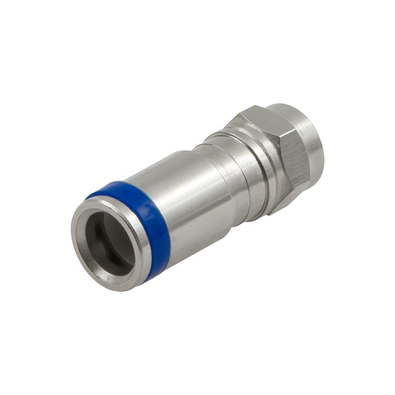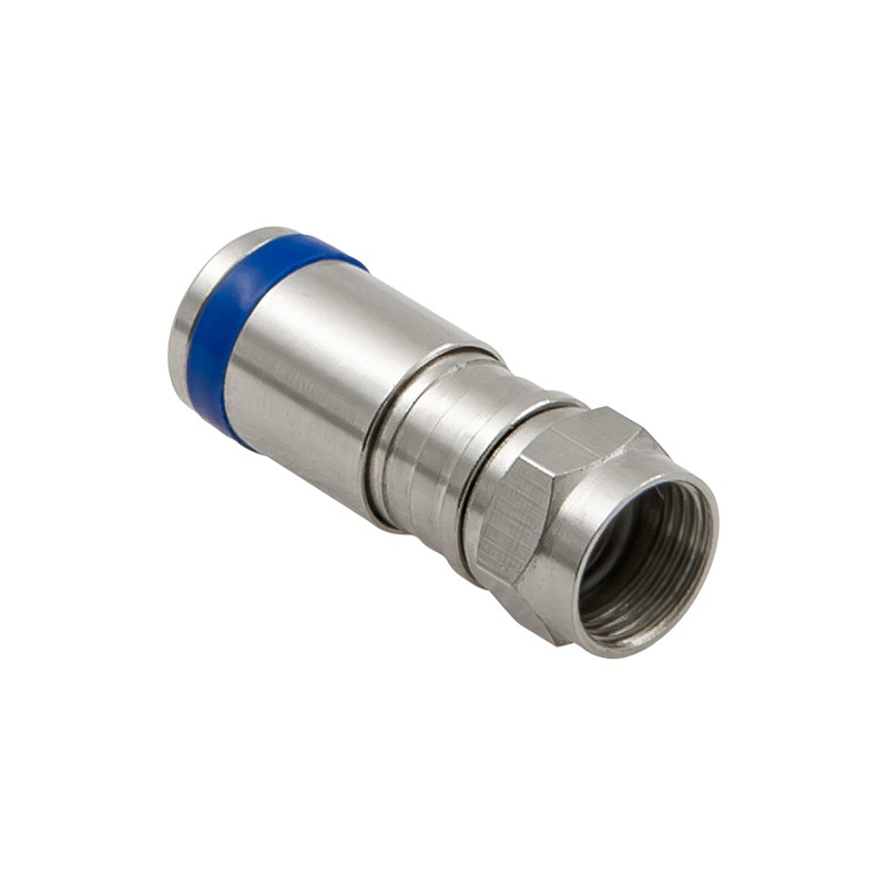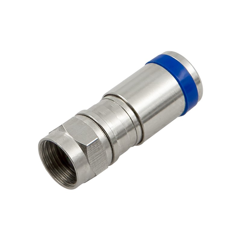 Компрессионный разъем F-типа (штекер) предназначен для монтажа на коаксиальные кабели формата RG‑6 (Ø6,8 мм). Фиксация на проводе выполняется пресс-клещами. Такой тип коннекторов монтируется быстро, надежно удерживается на проводе и выдерживает более 500 циклов подключения/отключения без потери качества соединения.