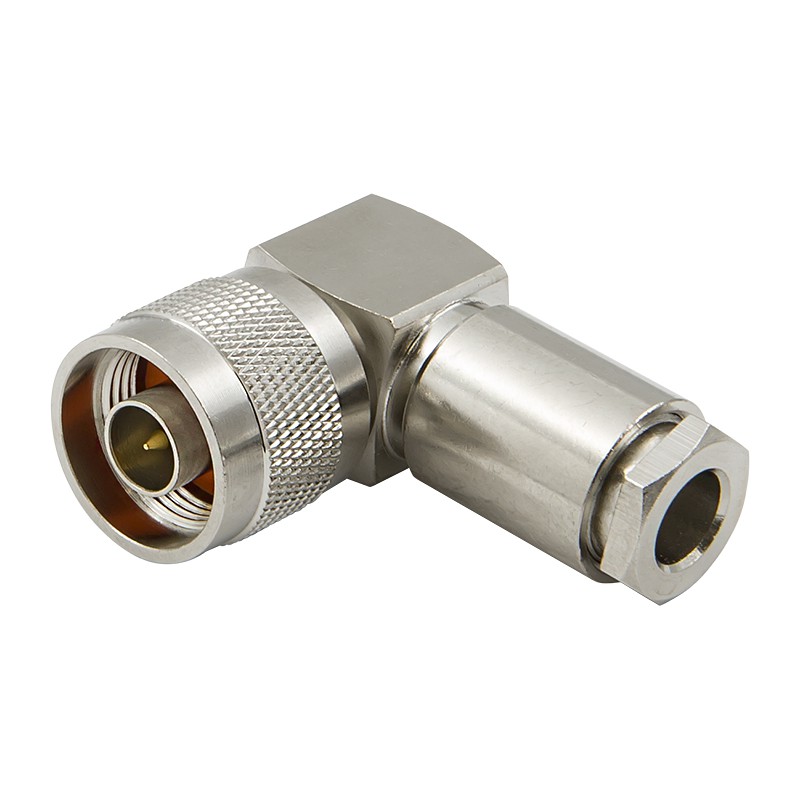- Угловая вилка N-type на 50 Ом. Разъем создает надежное резьбовое соединение, устойчивое к вибрациям. Рабочий диапазон — до 11 ГГц, что подходит для систем сотовой связи (2G–5G), WiFi и профессионального радиооборудования;