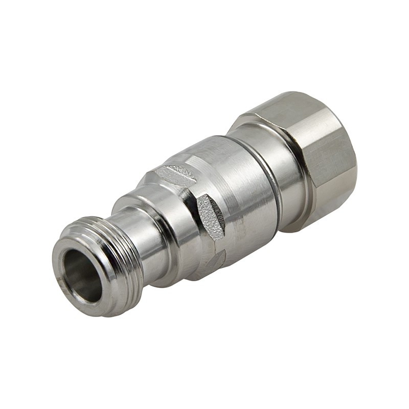 Коннектор N-female (розетка, «мама») для установки на коаксиальный фидер формата 1/2″. Разъем крепится на кабель прижимным методом без пайки, что упрощает его установку «в поле» в процессе основных монтажных работ. Подходит ко многим маркам коаксиального фидера и не требует использования специальных профессиональных инструментов.