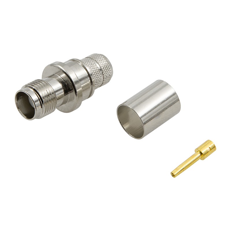 Коннектор TNC типа «розетка» для монтажа на коаксиал RG-213. Разъем устанавливается методом пайки центрального проводника к контактному пину и обжима экрана металлической втулкой — для этого применяют кримпер с подходящей матрицей. Резьбовое соединение обеспечивает надежную фиксацию даже в условиях постоянной вибрации, что делает разъем предпочтительным для транспорта, авиации и промышленного оборудования.