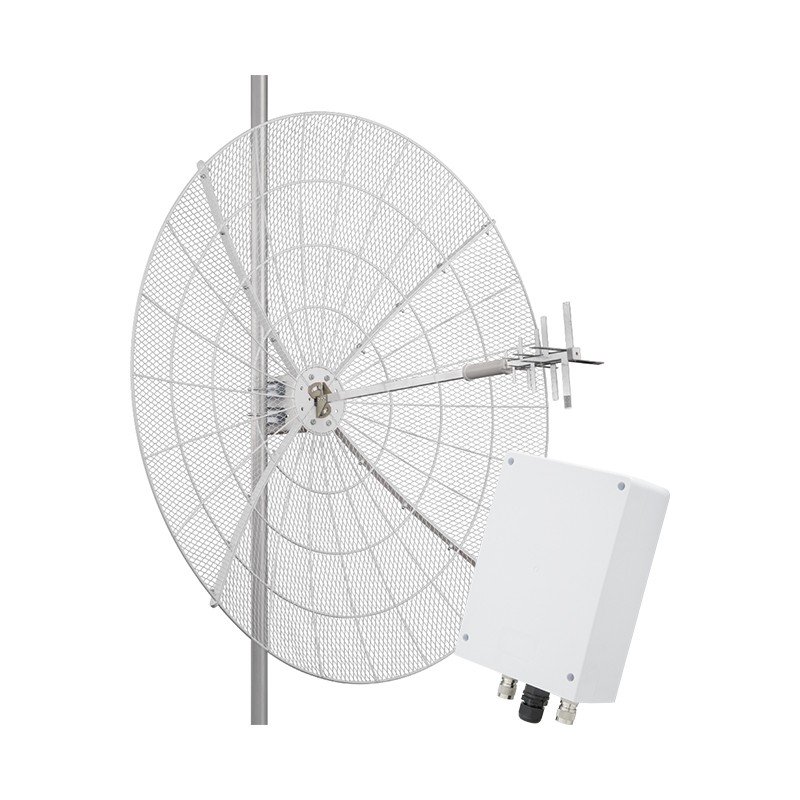 Параболические антенны заслуженно считаются наиболее «мощным» решением для усиления LTE-сети: они состоят из рефлектора большого диаметра и облучателя, расположенного в фокусе. Принятый сигнал передается по кабелю в герметичный бокс, где размещены модем и роутер. За счет малой длины кабелей на модем поступает качественный сигнал с минимальными потерями.