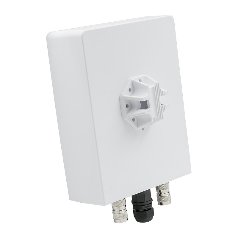 - Уличное исполнение антенны и роутера. Антенна и герметичный бокс с оборудованием устанавливаются рядом — на одной мачте или кронштейне для фасада. Установка бокса вблизи антенны сокращает длину радиокабелей, нужных для подключения, и обеспечивает передачу с наименьшими потерями.