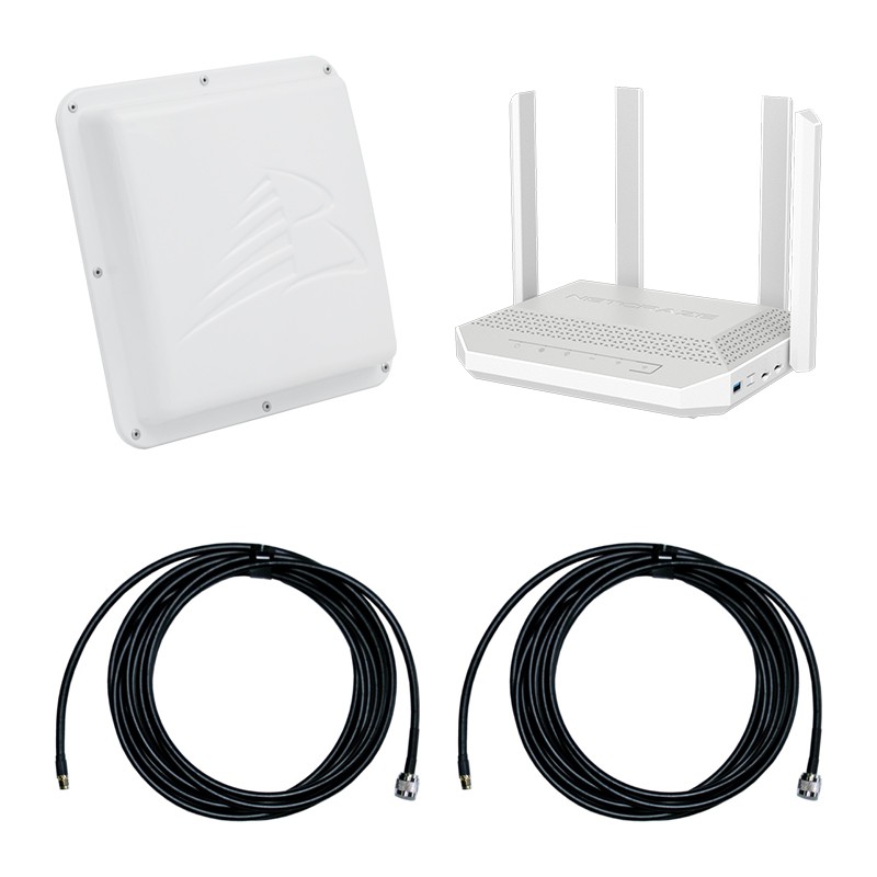 Основа комплекта — современный роутер Hopper 4G+ от компании Netcraze (бывший Keenetic). Прибор имеет интегрированный LTE-модем и оснащен сразу двумя SIM-слотами. Устройство функционирует так же, как обычный домашний роутер, только вместо кабеля интернет-провайдера использует SIM-карту одного из сотовых операторов.