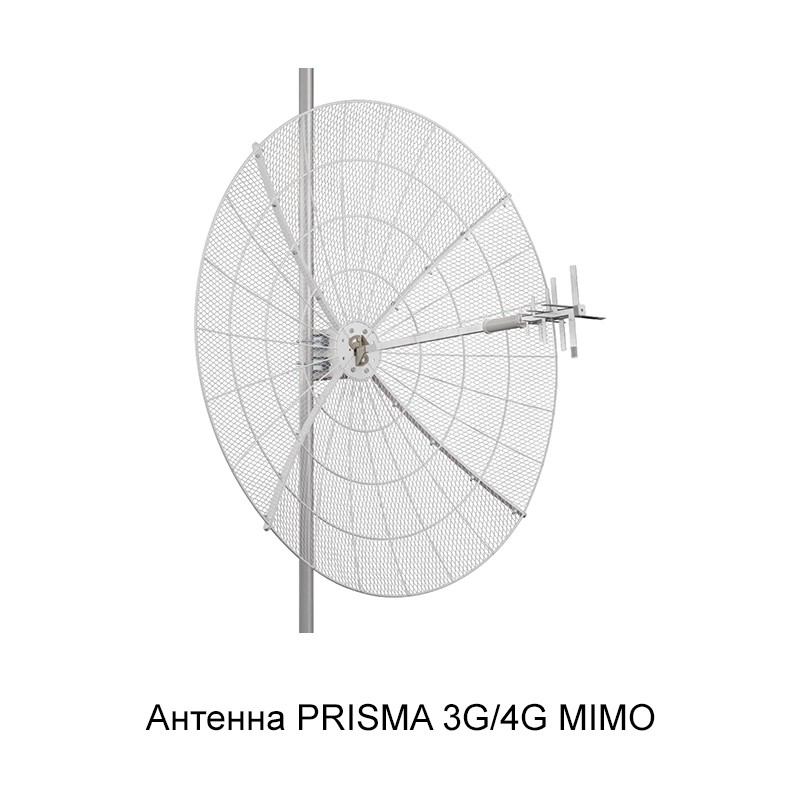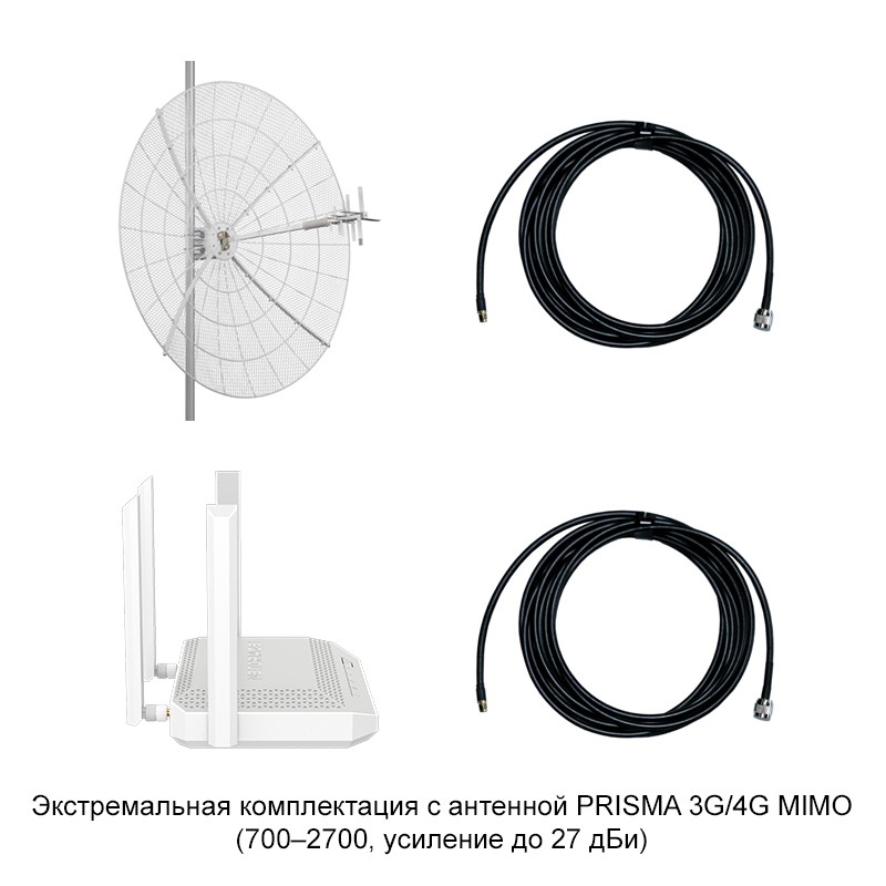 - Конфигурация «Экстремальная»: Наружная антенна PRISMA 3G/4G MIMO с усилением 27 дБи (диапазоны 790–960 МГц и 1700–2700 МГц, параболик Ø1,1 м). Самая мощная конфигурация с поддержкой любых диапазонов частот и очень высоким усилением. Подходит для удаленных районов, где мобильный сигнал практически пропадает даже на улице.