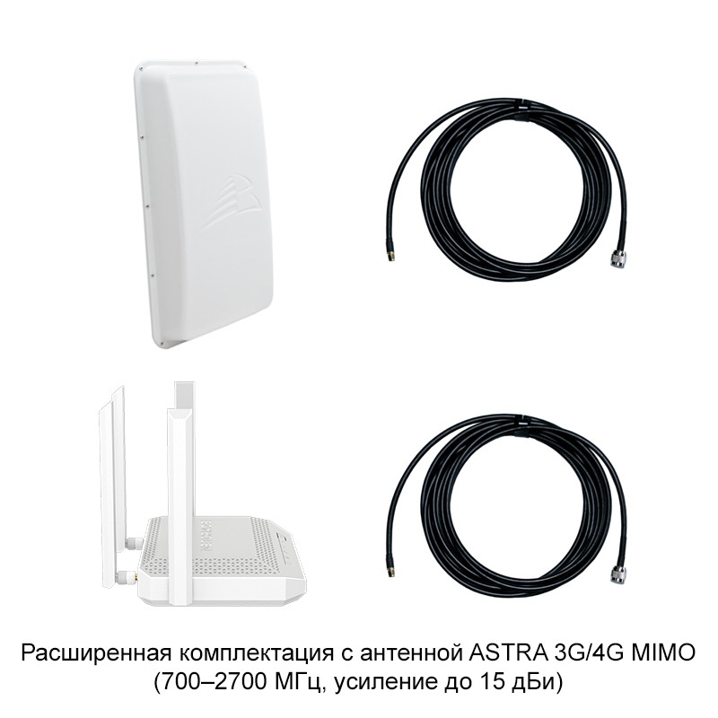 - Конфигурация «Расширенная»: Наружная антенна ASTRA 3G/4G MIMO с усилением 15 дБи (диапазоны 790–960 МГц и 1700–2700 МГц, панель 450 x 240 мм). В отличие от стандартной конфигурации, имеется поддержка низких частот, которые операторы применяют за городом (LTE B8/B20). Рекомендуется для дачных поселков, деревень, промзон при достаточно сигнале на улице;