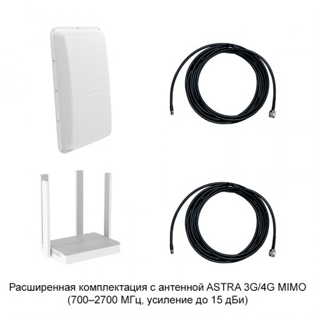 - Набор «Расширенный» включает улучшенную антенну ASTRA 3G/4G MIMO, которая поддерживает не только высокий диапазон частот (от 1700 до 2700 МГц), но также низкий диапазон от 790 до 960 МГц. Эта модель предназначена для загородной местности, где операторы могут использовать стандарты LTE-800 (B20) и LTE-900 (B8);