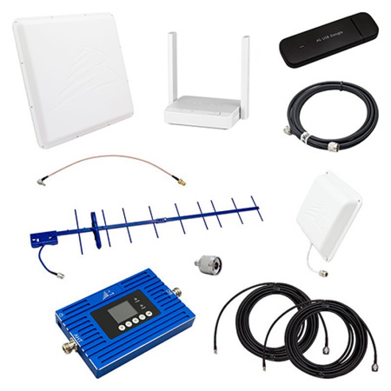 - GSM-связь (звонки). Система усиления на базе репитера и двух антенн, которая реализует надежное покрытие для звонков со смартфонов и мобильных телефонов на площади до 400 м2. В комплект входит волновой канал BS-900-14 («елочка»), усилитель BS-GSM-75 на 75 дБ и комнатная антенна VITA-5;